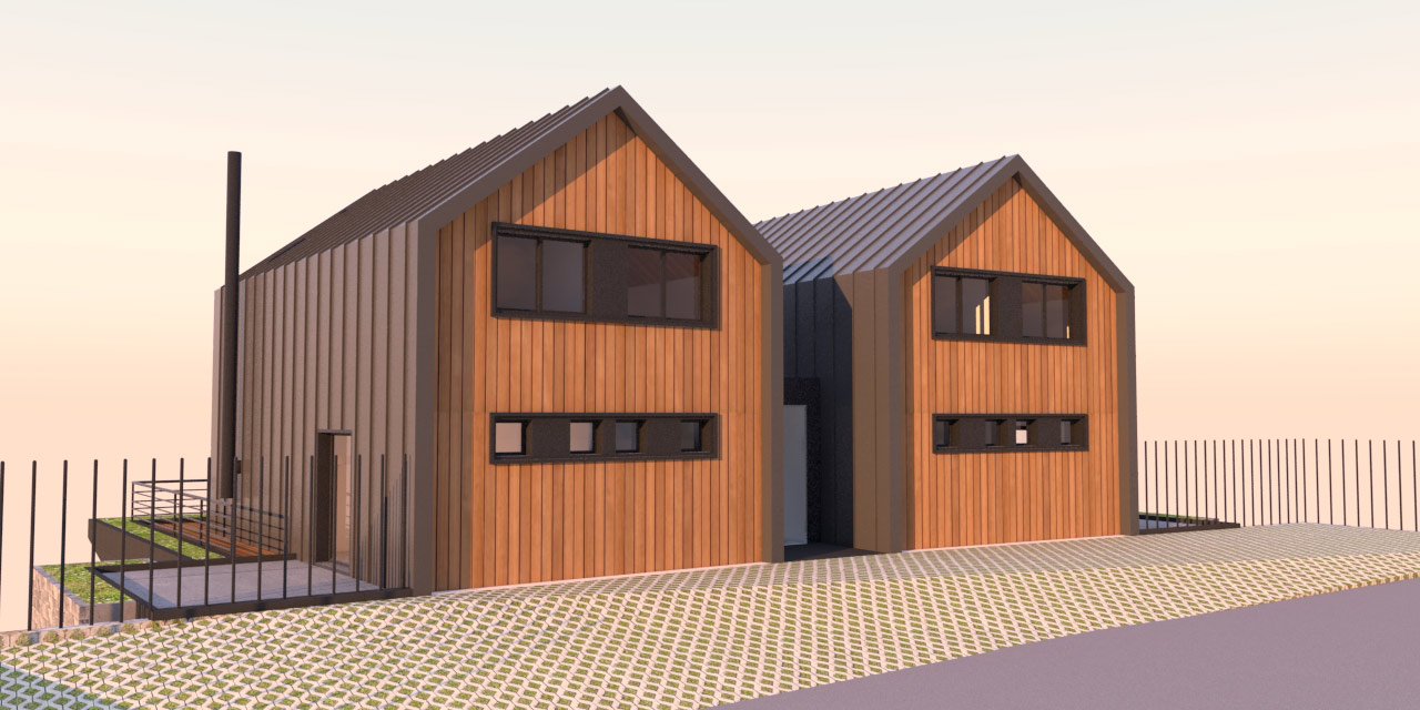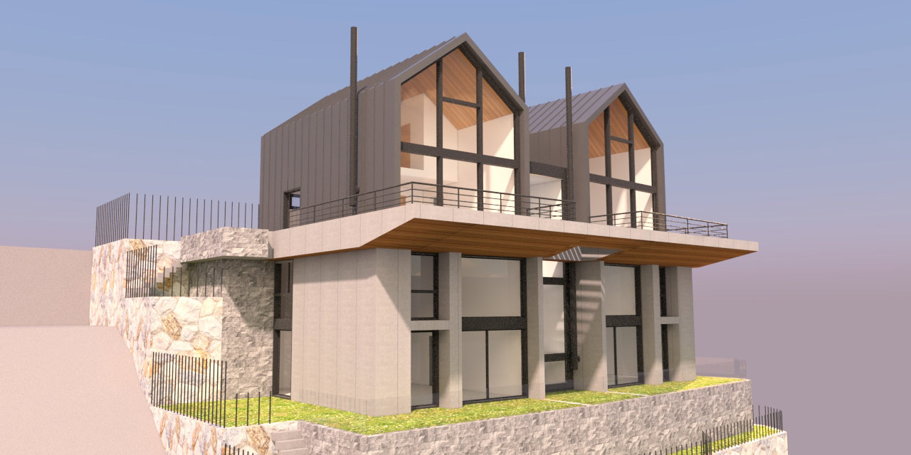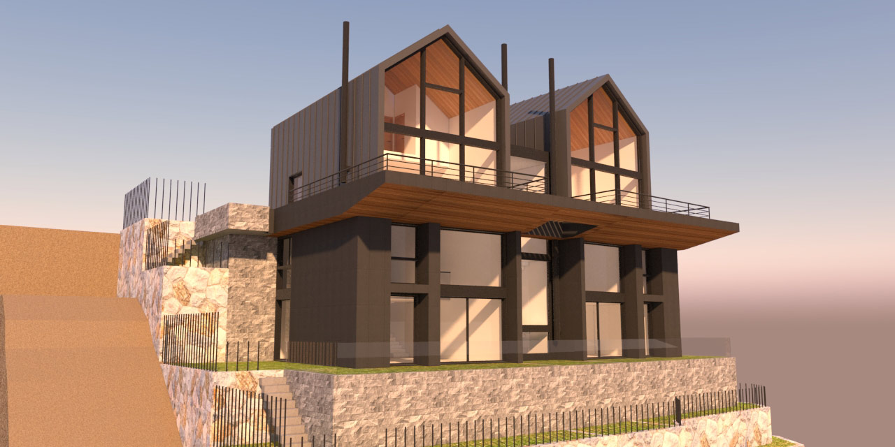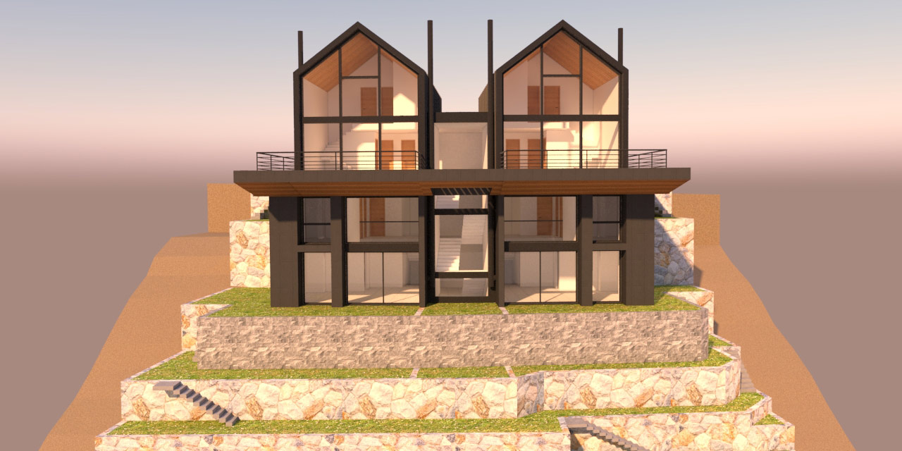 Located in the Kfardebian mountains in Lebanon, this project near the ski slopes offers a variety of luxurious chalets overlooking the Faraya mountains. The building sits on a steep slope making the design process more challenging. The symmetrical volume is divided by the entrance and staircase creating equal spaces for each of the two brothers.