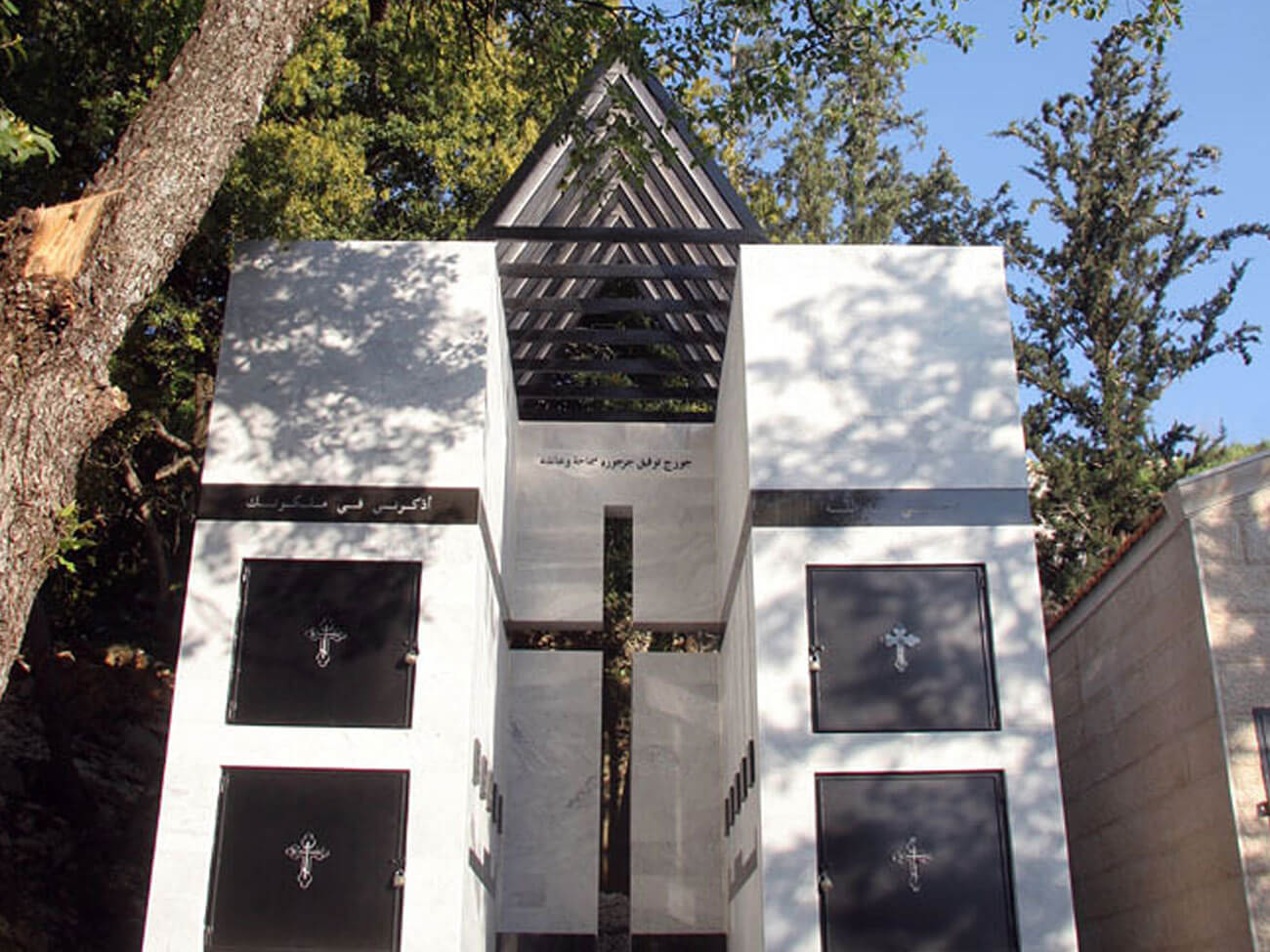 Within the context of sacred architecture this project seeks to concretize moral issues and sacred matters, believes and doubts, hope and faith, love and hate and transform them into architectural forms. These architectural forms have engaged religious symbols such as (cross, equilateral triangles, square(s)), relevant numbers such as (3, 7, 10, and 40) and symbolic colors (white and black). Religion and symbolism are at all times attached and inseparable. The location of the project at the center of the cemetery and at the end of an important axe suggests the idea of a monumental volume.